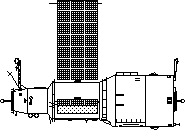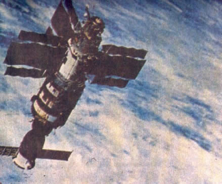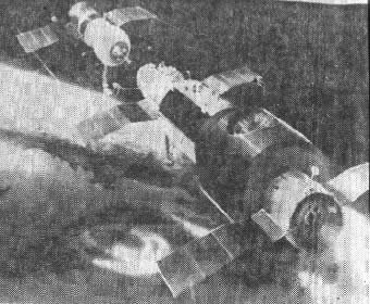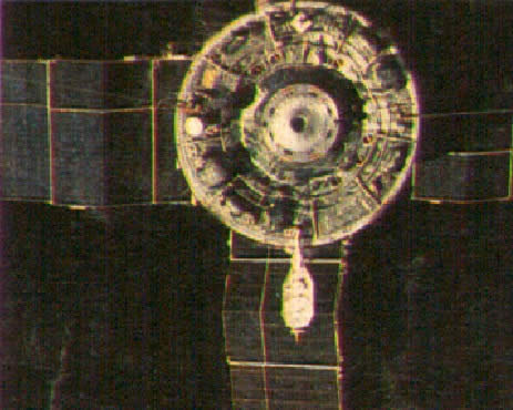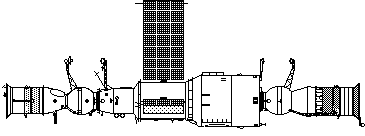 Desenho da estação Salyut 7 acoplada com a nave Soyuz e Progress