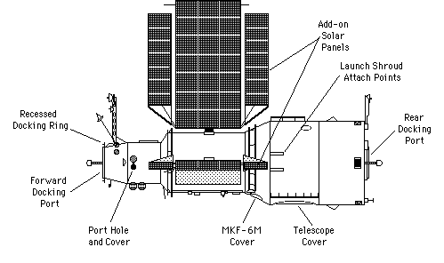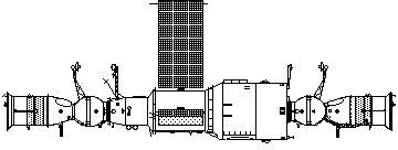 Desenho da estação Salyut 7 acoplada com duas naves Soyuz